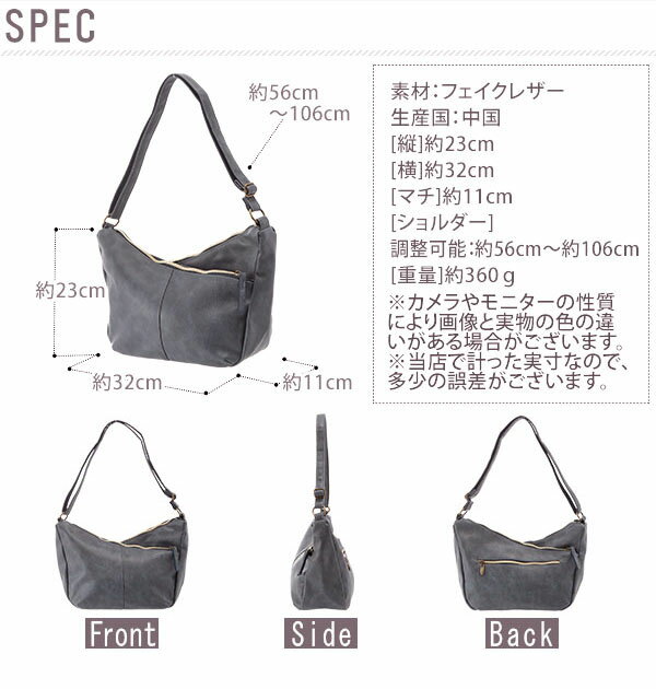 素材フェイクレザー生産国中国製サイズ[縦]約23cm×[横](上部)約32cm[マチ]約11cmショルダーベルトサイズ [長さ]約56cm〜約106cm※サイズは当店平置き実寸サイズです。