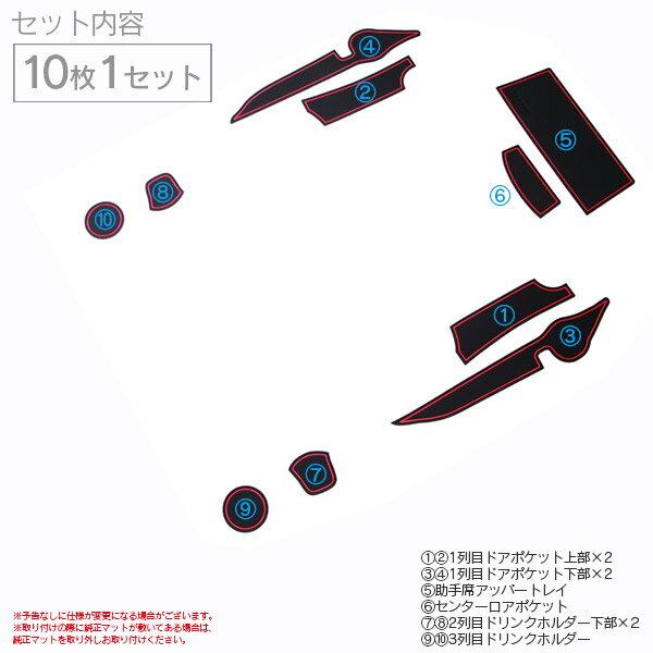 あす楽,DIY,カーパーツ,カー用品,社外,カスタム,イルミ,LED,ポジション,ドレスアップ,カスタマイズ,ホワイト,ブルー,簡単取付,専用,コンソール,収納,ドアポケット,ゴムゴムマット,ラバー商品詳細 汚れや傷防止に センターコンソール、ドリンクホルダーなど結構汚れたりしますが、 この便利なアイテムが汚れ、傷の防止や、異音などを軽減し、 それと同時に室内をオシャレにドレスアップ! ゴム素材なので 水で洗えてお手入れ簡単! セット内容 10ピース1セット (1)(2)1列目ドアポケット上部×2 (3)(4)1列目ドアポケット下部×2 (5)助手席アッパートレイ (6)センターロアポケット (7)(8)2列目ドリンクホルダー下部×2 (9)(10)3列目ドリンクホルダー ※取り付けの際に純正マットが敷いてある場合は、純正マットを取り外しお取り付けください。